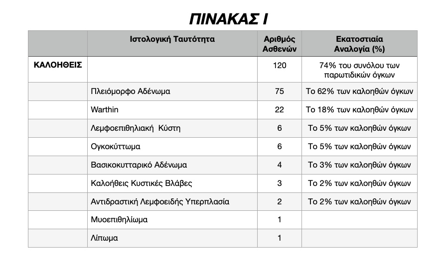Στους ασθενείς με καλοήθεις όγκους παρωτίδος, ο συχνότερος όγκος ήταν το Πλειόμορφο Αδένωμα (Μεικτός Όγκος).
