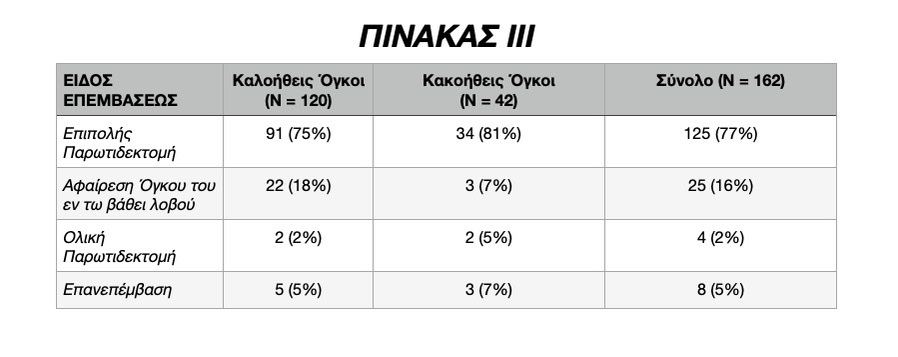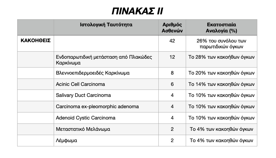 Στην βιβλιογραφία συνήθως αναφέρεται ότι επι του συνόλου των όγκων της Παρωτίδος, το ποσοστό στο οποίο αυτοί οι όγκοι είναι κακοήθεις, ανέρχεται στο 15% έως 20%. Στην παρούσα εργασία, οι κακοήθεις όγκοι της παρωτίδος (Πρωτοπαθείς και Μεταστατικοί) ανήλθαν στο 26%.