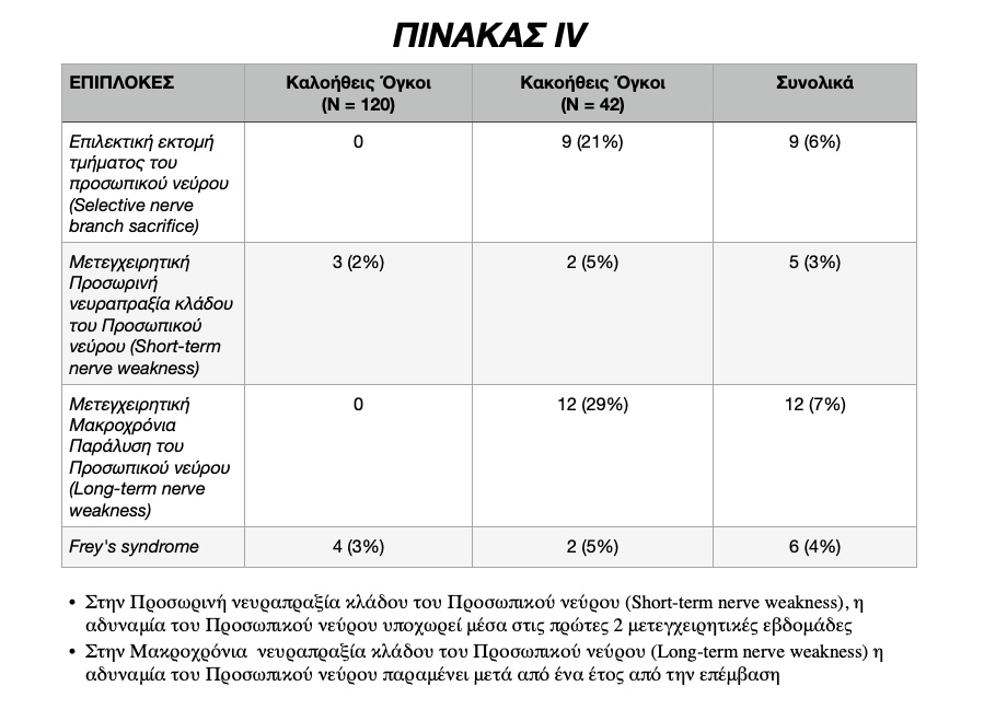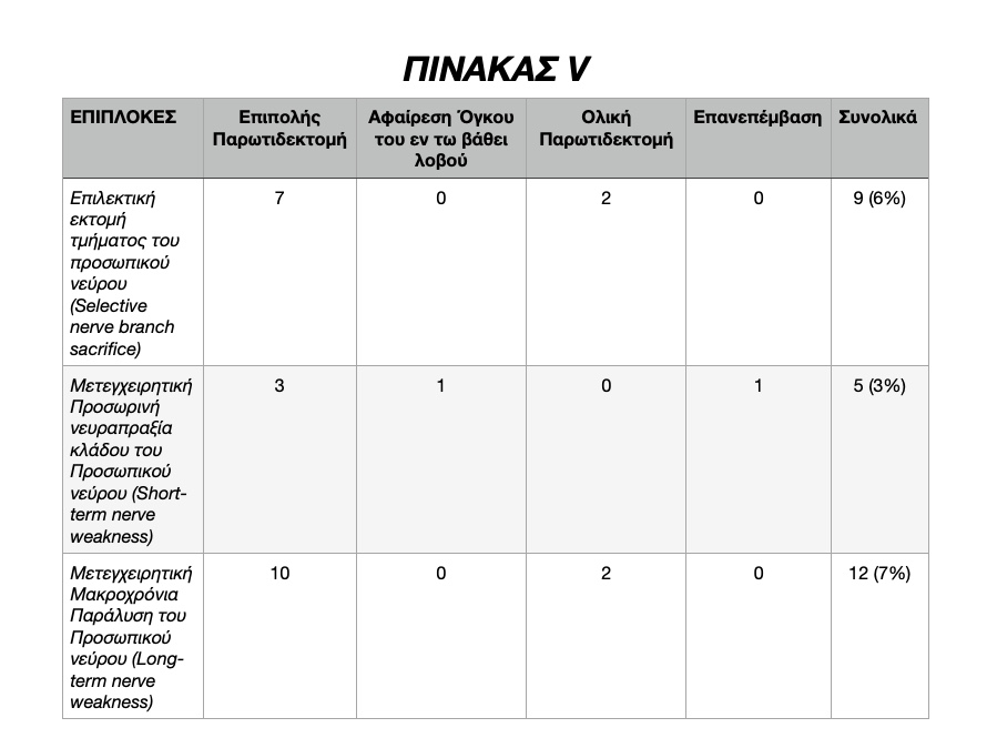 Στην παρούσα μελέτη, στο σύνολο των Παρωτιδεκτομών, η μετεγχειρητική προσωρινή νευραπραξία κλάδου του Προσωπικού νεύρου (Short-term nerve weakness) ανήλθε στο 3% του συνόλου των επεμβάσεων (5 ασθενείς). Η συχνότητα εμφανίσεως παροδικής, μετεγχειρητικής νευραπραξίας παρατηρήθηκε στο 2% των καλοήθων νεοπλασιών και στο 5% των κακοήθων νεοπλασιών.