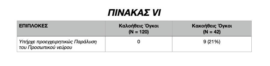 Στους ασθενείς οι οποίοι υπεβλήθησαν σε χειρουργική επέμβαση για καλοήθη νεοπλασία της Παρωτίδος (Ν=120), ουδείς παρουσίασε Μετεγχειρητική Μακροχρόνια Νευραπραξία κλάδου του Προσωπικού νεύρου (Long-term nerve weakness). Στους ασθενείς αυτούς, με καλοήθη νεοπλασία της Παρωτίδος, παρουσιάστηκε Μετεγχειρητική Προσωρινή νευραπραξία κλάδου του Προσωπικού νεύρου (Short-term nerve weakness) σε 3 ασθενείς (δηλαδή στο 2% των ασθενών με καλοήθη νεοπλασία της παρωτίδος), η οποία αποκαταστάθηκε πλήρως σε ένα μικρό χρονικό διάστημα 20 ημερών.